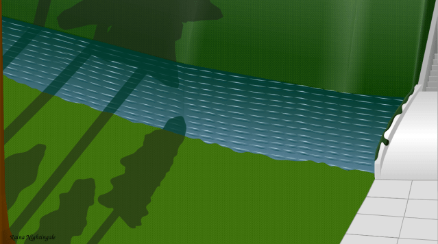 Water lies at the back of the terraces of Frèlin. Some of these lakes are very small and shallow, while some of them are quite wide and deep. Boats are moored at the bridges over the larger ones, and the elves can row about on them at pleasure. White bridges, often hung with moss or water-loving vines, span the terraces, and stairways, sometimes zig-zagged, rise up the terraces with the earth held up by retaining walls. Everywhere, different kinds of life flourish according to the season, from various types of deciduous and evergreen trees, conifer and otherwise, which make the homes of many of the elves, to herbal gardens, wild flowers, and climbing vines, plants that live in swamps, or in water itself, or in well-drained or rocky soil thriving here or there. Fruit-bearing trees and plants, and tended gardens for fruit or vegetables, can also be found.