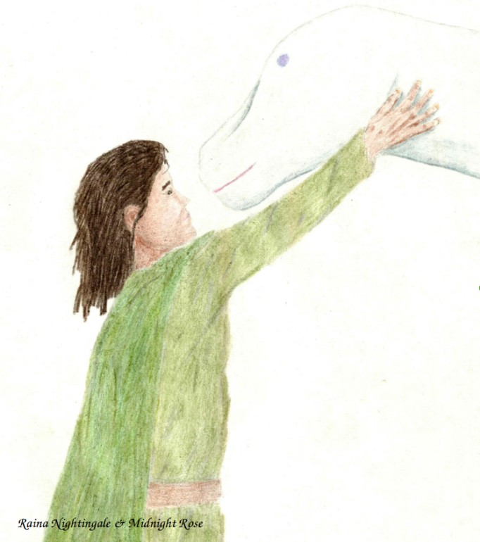 Before long, he saw her shimmering white length and wings against the rapidly darkening blue-purple of the sky. She landed before him, her happiness flashing forth white beauty.
