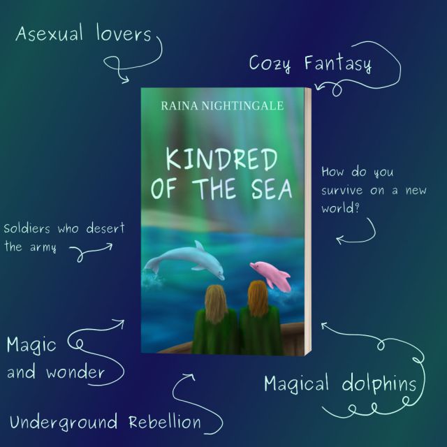New cover by Midnight Rose for Kindred of the Sea by Raina Nightingale, a platonic romance of asexual lovers, a cozy fantasy with portals, magical dolphins, dragons, and more!