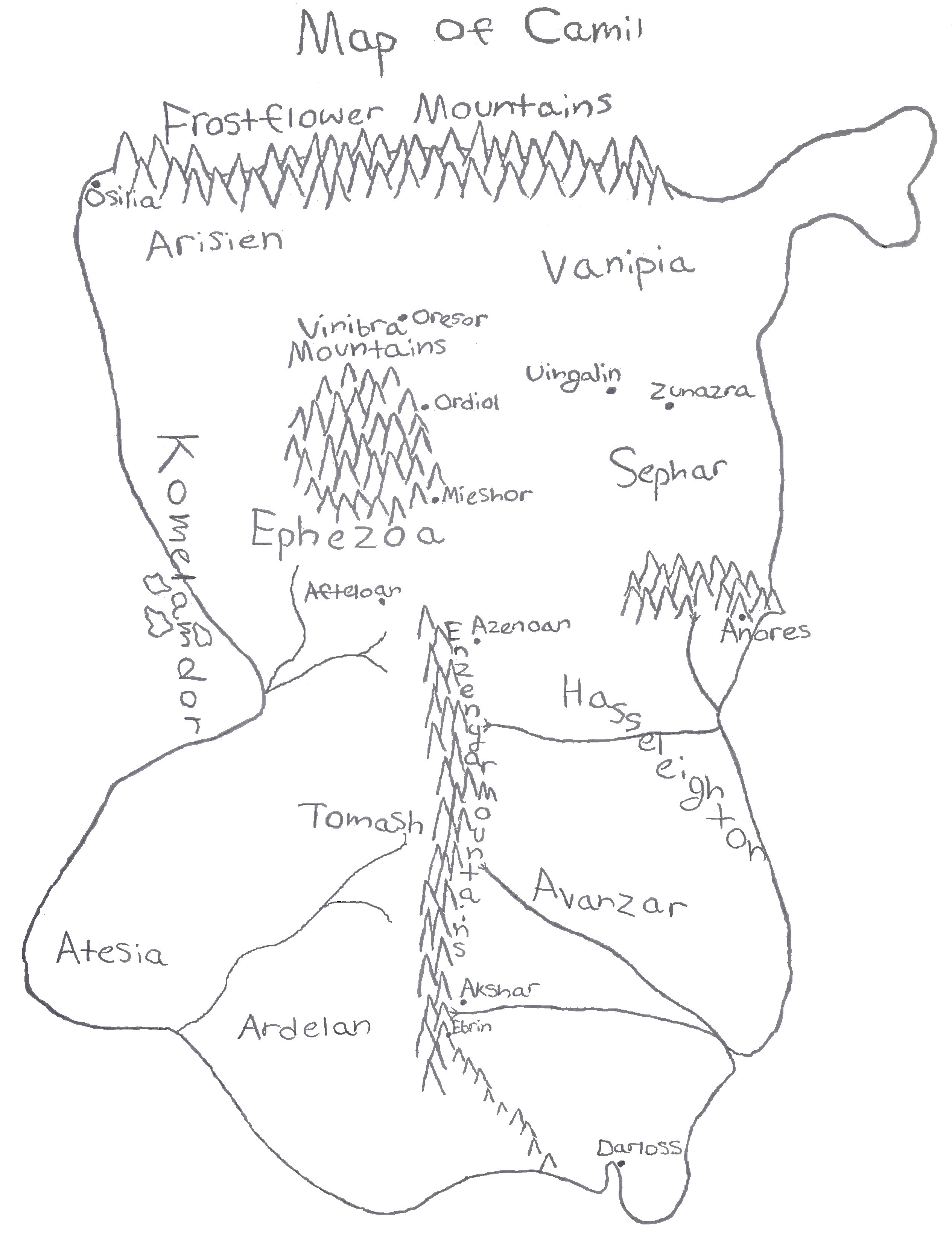 South and east of Syrwe is Camil, a land with several mountain ranges including the highest mountain range in inhabited Kaarathlon, the Frostflower Mountains, and a collection of volcanic mountains, called the Vinibra (Volcanic) Mountains, a desert, a relatively arid southern region, and vast jungles and swamps across its interior and northern regions. Its people are predominantly quite dark, in keeping with the strong light and heat of the sun in their lands. In the time of Kathreen Alarion and her mentor, Ishtailor, it boasted a variety of different countries with varying social customs and diplomatic relationships.